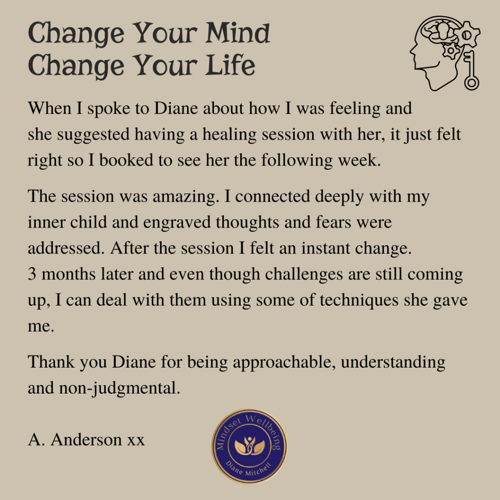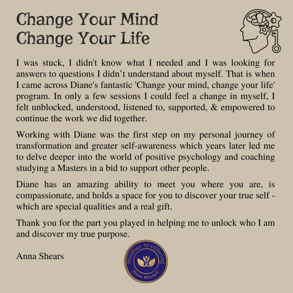 Change your mind, change your life. A holistic approach to changing the mind. Diane Mitchell Mindset Wellbeing