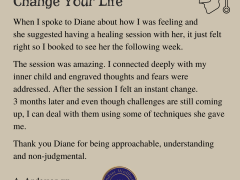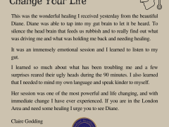 "This was the wonderful healing I received yesterday from the beautiful Diane. Diane was able to tap into my gut brain to let it be heard.... To silence the head brain that feeds us rubbish and to really find out what was driving me and what was holding me back and needing healing. It was an immensely emotional session and I learned to listen to my gut.... I learned so much about what has been troubling me and a few surprises reared their ugly heads during the 90 minutes.... I also learned that I needed to mind my own language and speak kinder to myself.... Her session was one of the most powerful and life changing - and with immediate change - I have ever experienced.. If you are in the London Area and need some healing I urge you to see Diane."