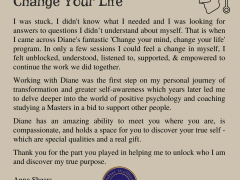 I am so happy with the results of my session with Diane. I really enjoyed our time together and I was able to create a real tangible change in my life just with one meeting. I am very grateful and would definitely recommend 'Change Your Mind Change Your Life' process to anyone who is looking for transformation. Thank you very much.