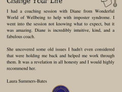 "I began a series of coaching/mentoring sessions with Diane almost 6 months ago after having a one to one session earlier in the year. I had been through a series of challenges in my personal life over the previous two years and felt so much better after my one to one session that I wanted to continue the support over a period of time to embed positive change. From an outside perspective my life over the course of the mentoring has changed very little but the internal changes for me have left been a complete transformation. All of my relationships have improved through being able to communicate in a way that is more honest and true to myself. I no longer feel the need to ‘people please’ at the detriment to my own wellbeing and have found a new confidence in myself and my decision making. Throughout the process Diane has been such a brilliant support, offering guidance to build my own insight through our sessions to help me navigate my way to a whole new way of feeling, being and experiencing my life. It has been completely transformative and the best gift I have ever given myself."